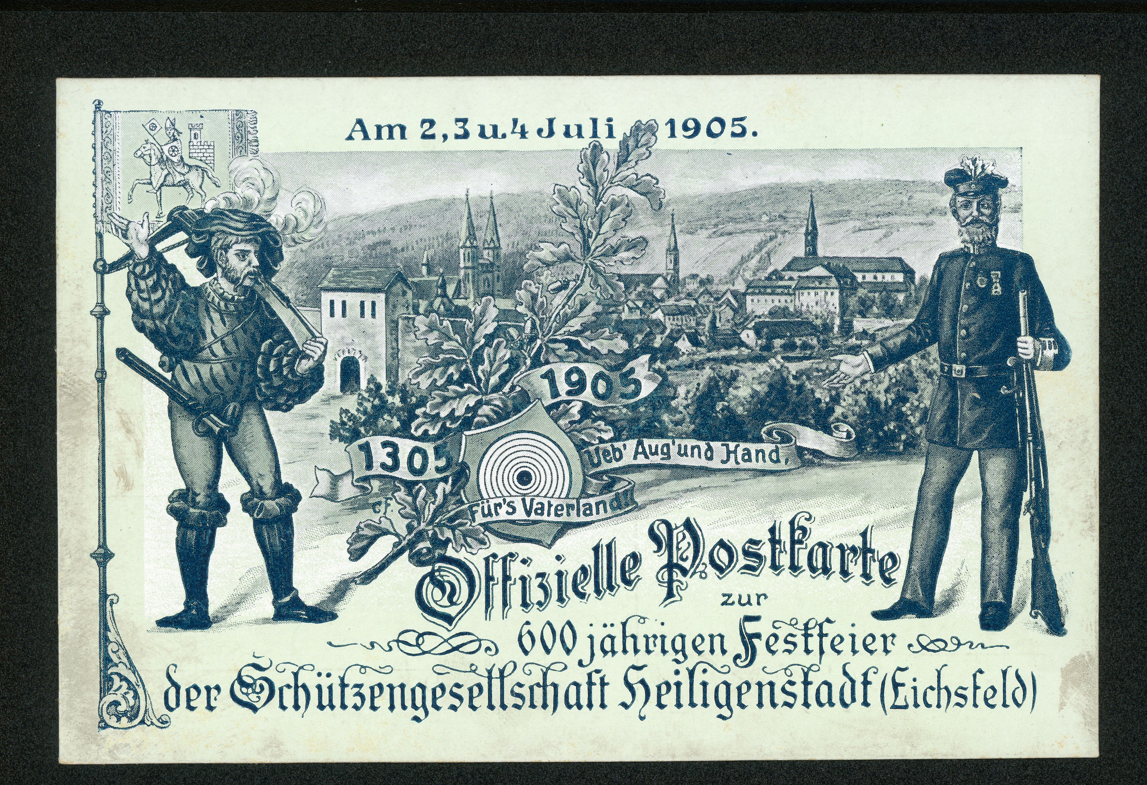 Ort Heiligenstadt Motive Offizielle Postkarte zur 600 jährigen Festfeier der Schützengesellschaft Heiligenstadt ''Eichsfeld'' Am 2, 3 u. 4 Juli 1905 Format klein Jahr 1905 Verlag - Bestell- oder Individualnummer - Tags Schützenfest Gewehr
