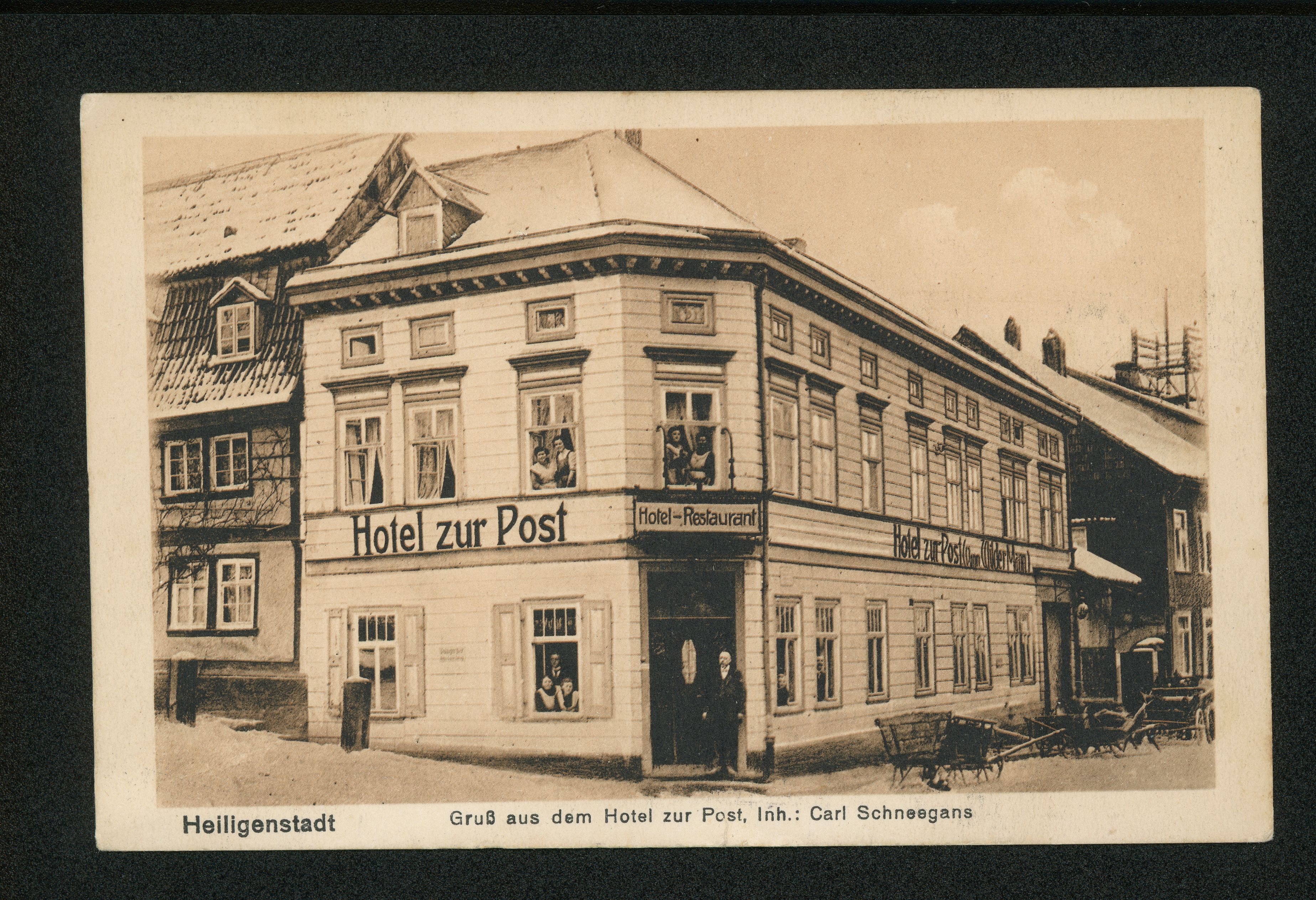 Ort Heiligenstadt Motive Gruß aus dem Hotel zur Post, Inh.: Carl Schneegans Format klein Verlag A. Hildebrand, Erfurt N. Bestell- oder Individualnummer 9062 Tags Hotel-Restaurant Gasthaus Hotel zur Post ''vorm. Wilder Mann''