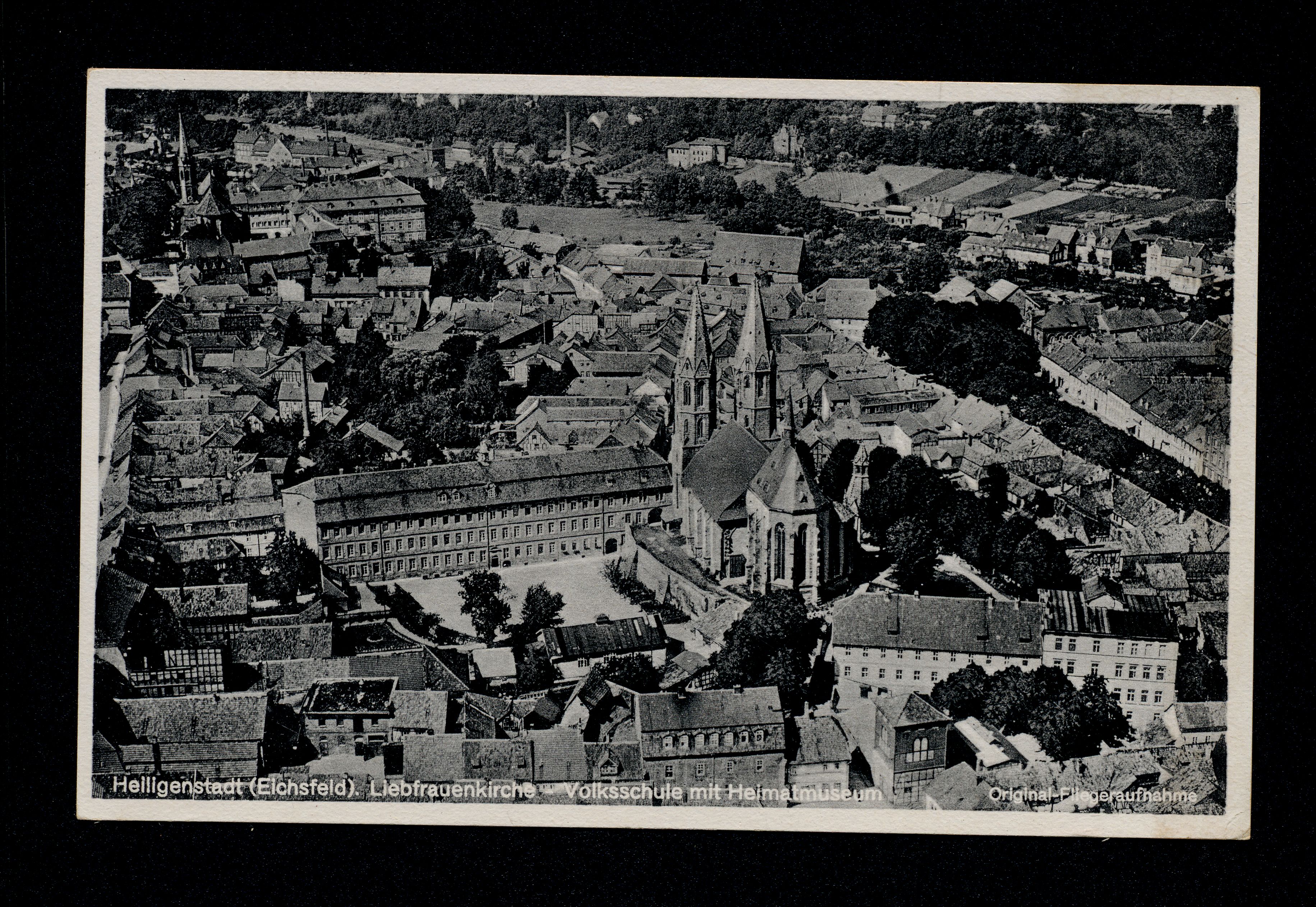 Ort Heiligenstadt Motive Liebfrauenkirche Volksschule mit Heimatmuseum Original-Fliegeraufnahme Format klein Jahr 1942 Verlag Albert Multhauf, Heiligenstadt Bestell- oder Individualnummer k 92 Nr. 27390 Tags Luftbild