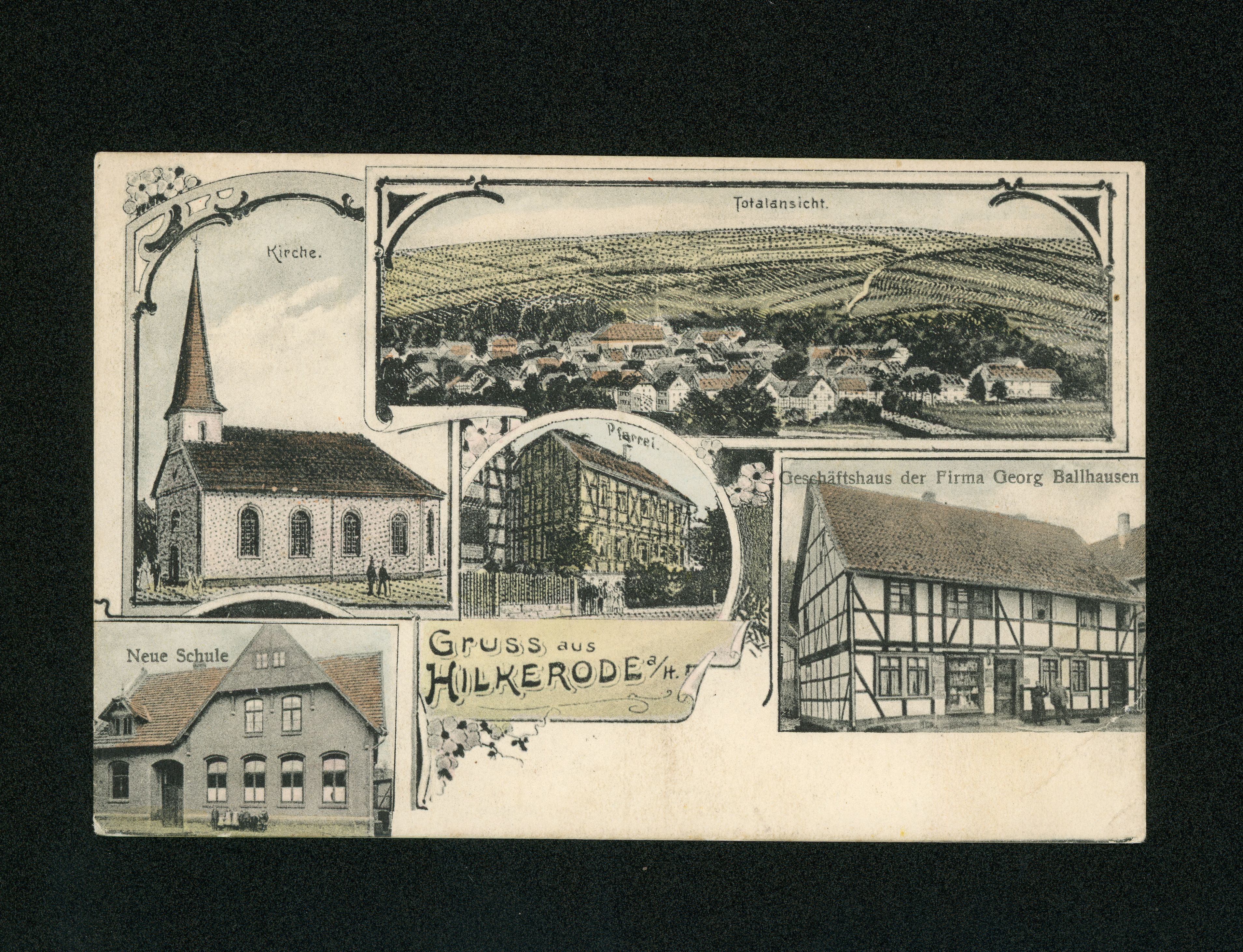 Ort Hilkerode Motive Kirche Totalansicht Neue Schule Pfarrei Geschäftshaus Firma Georg Ballhausen Format klein Verlag Paul Jancke, Berlin Bestell- oder Individualnummer -