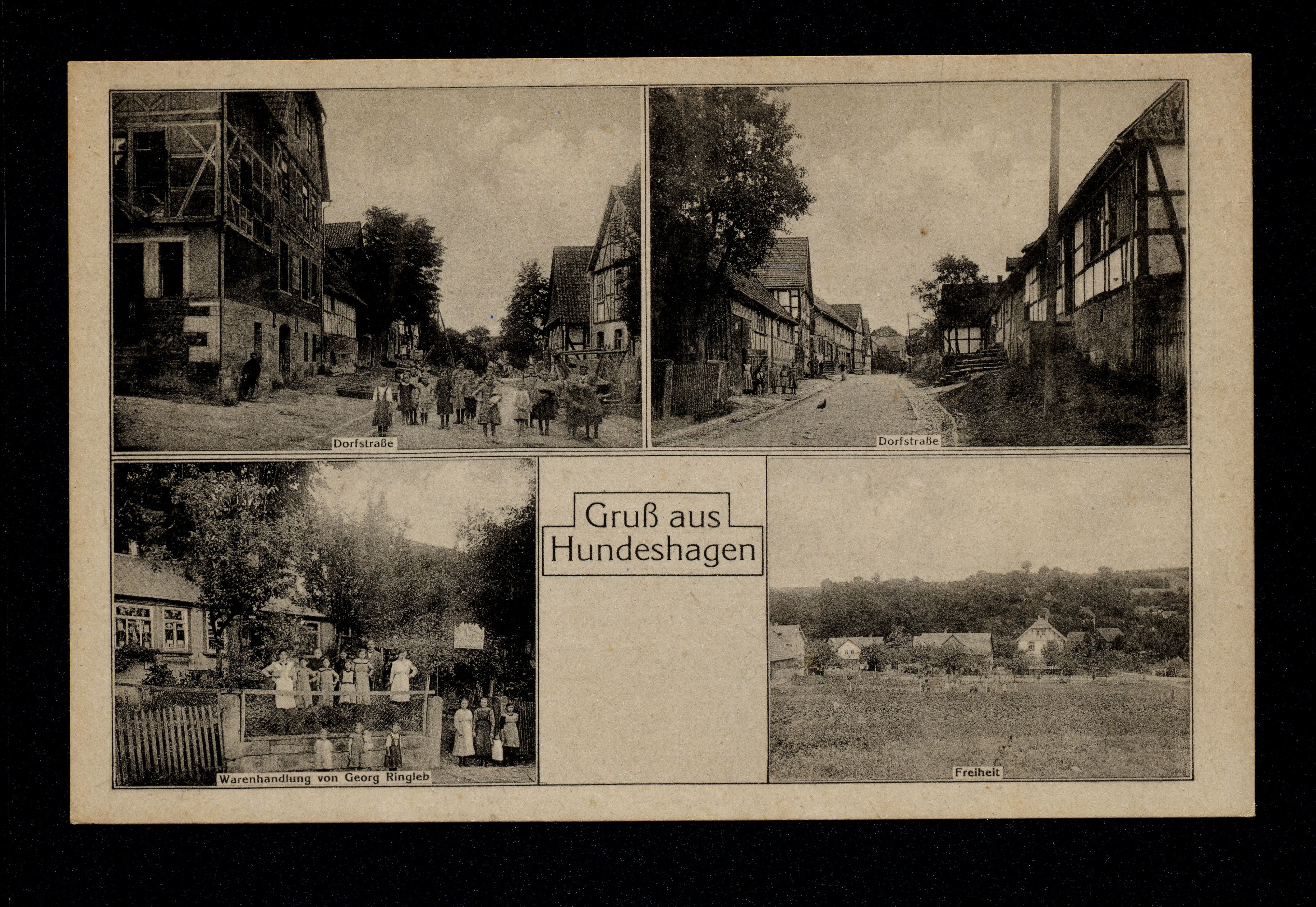Ort Hundeshagen Motive Dorfstraße Warenhandlung von Georg Ringleb Freiheit Format klein Jahr 1919 Verlag Aloys Mecke, Duderstadt Bestell- oder Individualnummer 19 14615 Tags Warenhandlung Drogerie Flaschenbier Verkauf Cigarren & Cigaretten Georg Ringleb