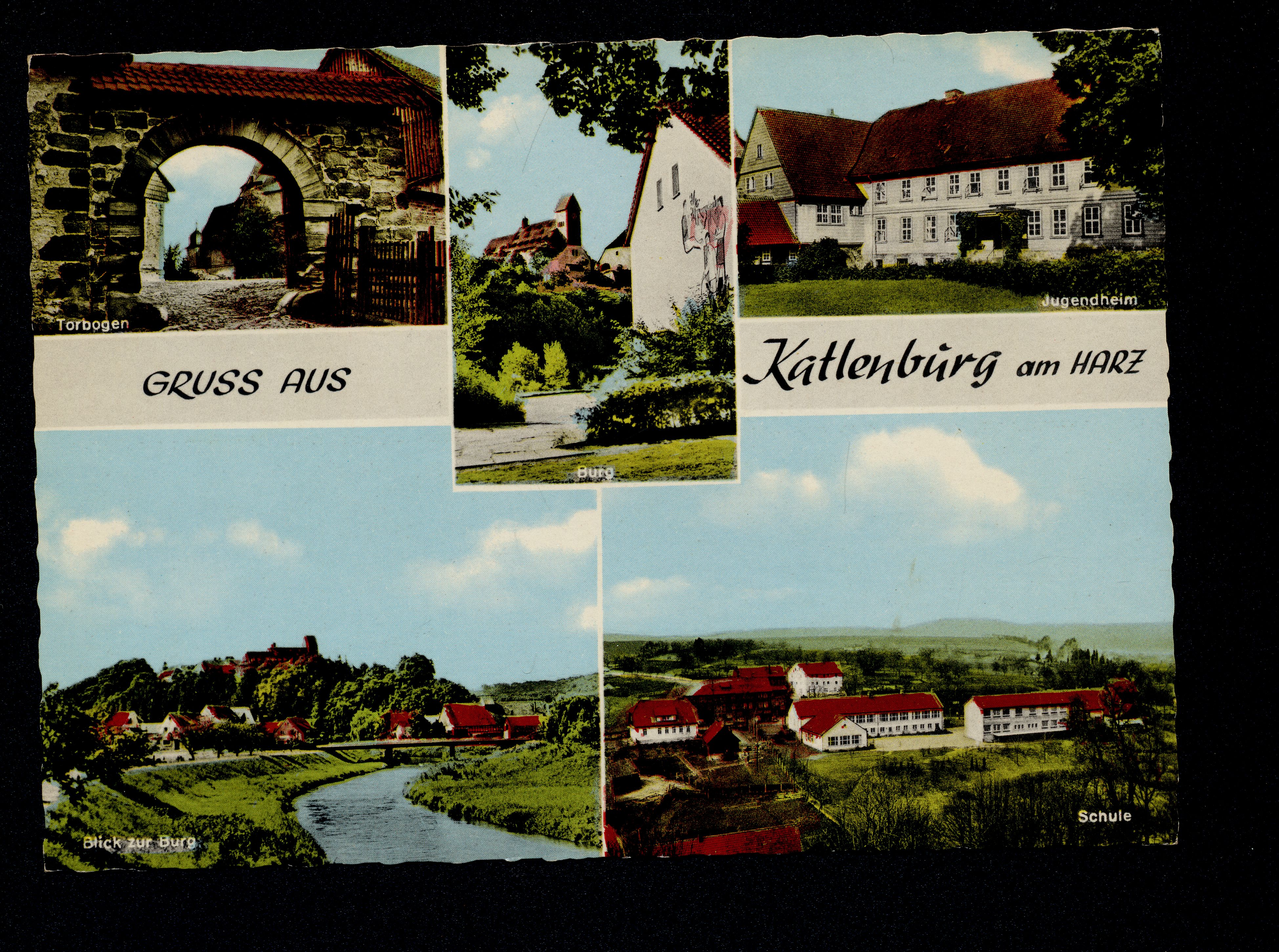 Ort Katlenburg Motive Torbogen Jugendheim Blick zur Burg Schule Burg Format groß Verlag Walter Jappe, Lübeck Bestell- oder Individualnummer 10368 Tags Rhume Bundessiedlerschule