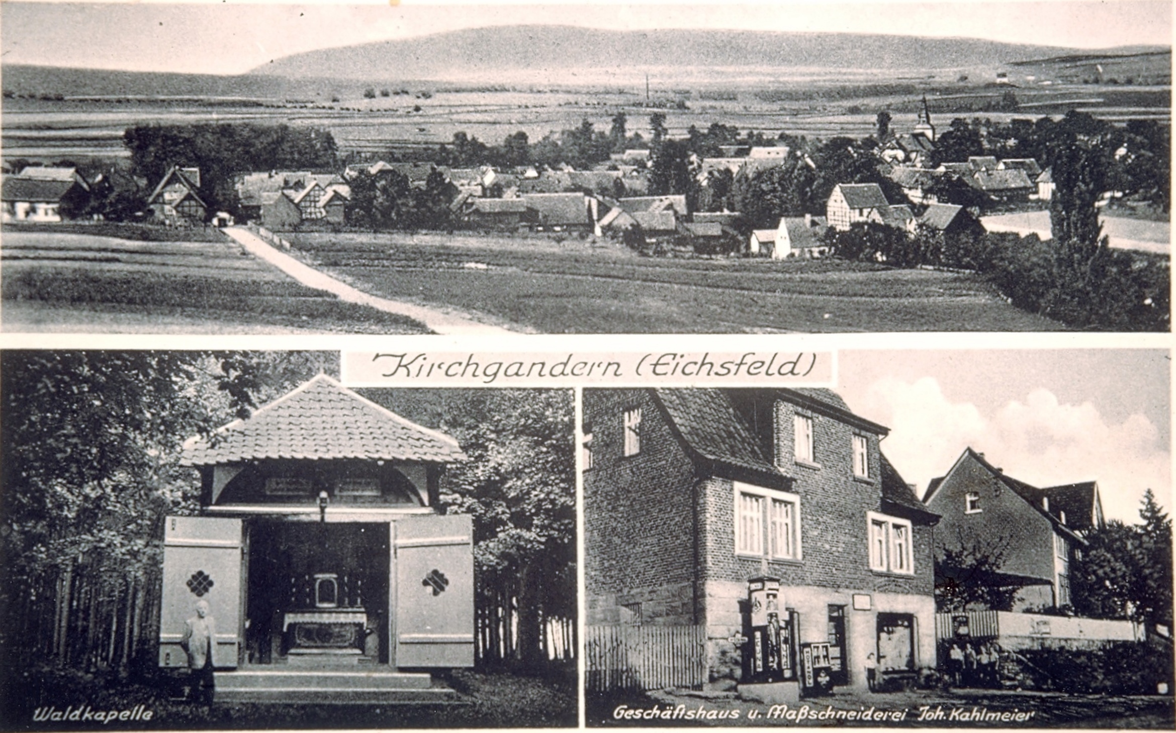 Ort Kirchgandern Beschreibung Sammlung: Klaus Sippel Motive Panorama Waldkapelle Geschäftshaus u. Maßschneiderei Joh. Kahlmeier Format klein Verlag - Bestell- oder Individualnummer - Tags Tankstelle Leuna