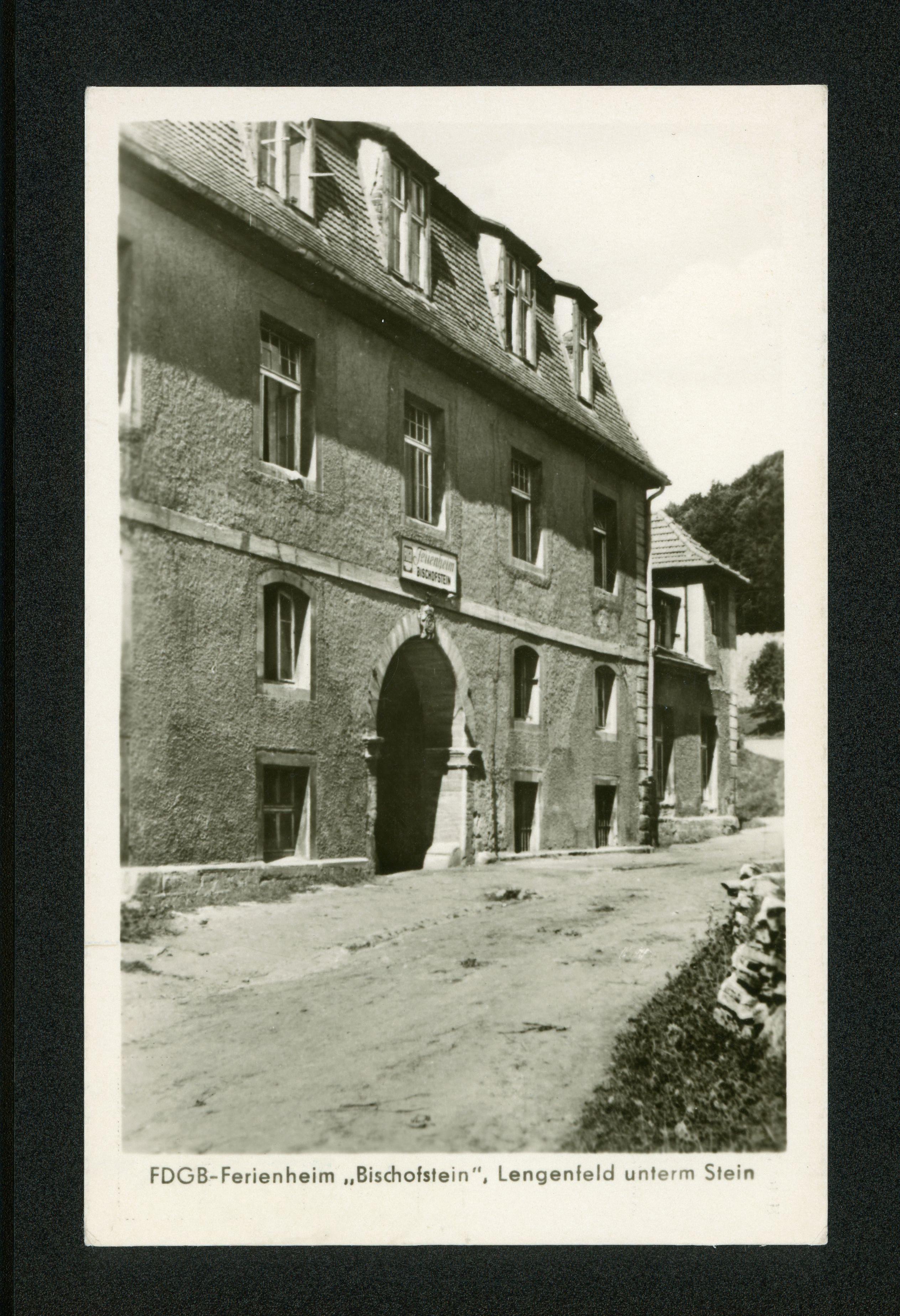 Ort Lengenfeld unterm Stein Motive FDGB-Ferienheim ''Bischofstein'' Format klein Jahr 1953 Verlag Volkskunstverlag, Reichenbach i. V. Bestell- oder Individualnummer Best.-Nr. VF 1033 V/11/28 / A 5211/53