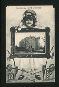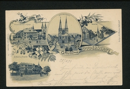 Spiegelbrücke mit Westerthurm, Ursulinen-Kloster, Bahnhofstr. m. evang. Kirche, Rathhaus, Panorama, Kath. Probstei-Kirche mit Schule |