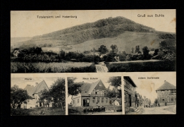 Schule, Gasthof z. Goldnen Kreuz v. Wilh. Brodmann, Kirche, Dorfstrasse |