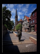 Blick auf die Martinskirche mit Theodor-Storm-Plastik |