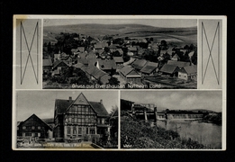 Teilansicht, Wappen, Kirche mit Kriegerdenkmal, Rhumequelle, Schule |