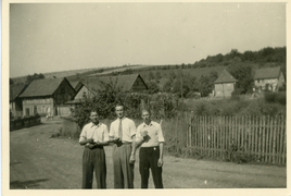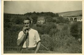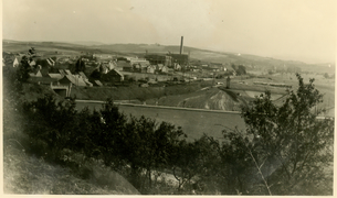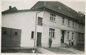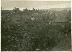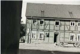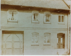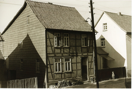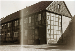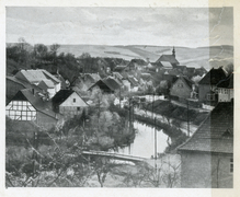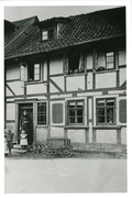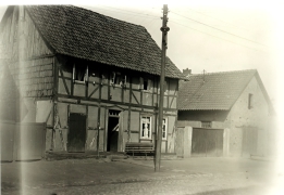 Trocknung der Tabakblätter, Ziehbrunnen in Obernfeld um 1925 vor einem mit Tabakblättern behangenen Haus |