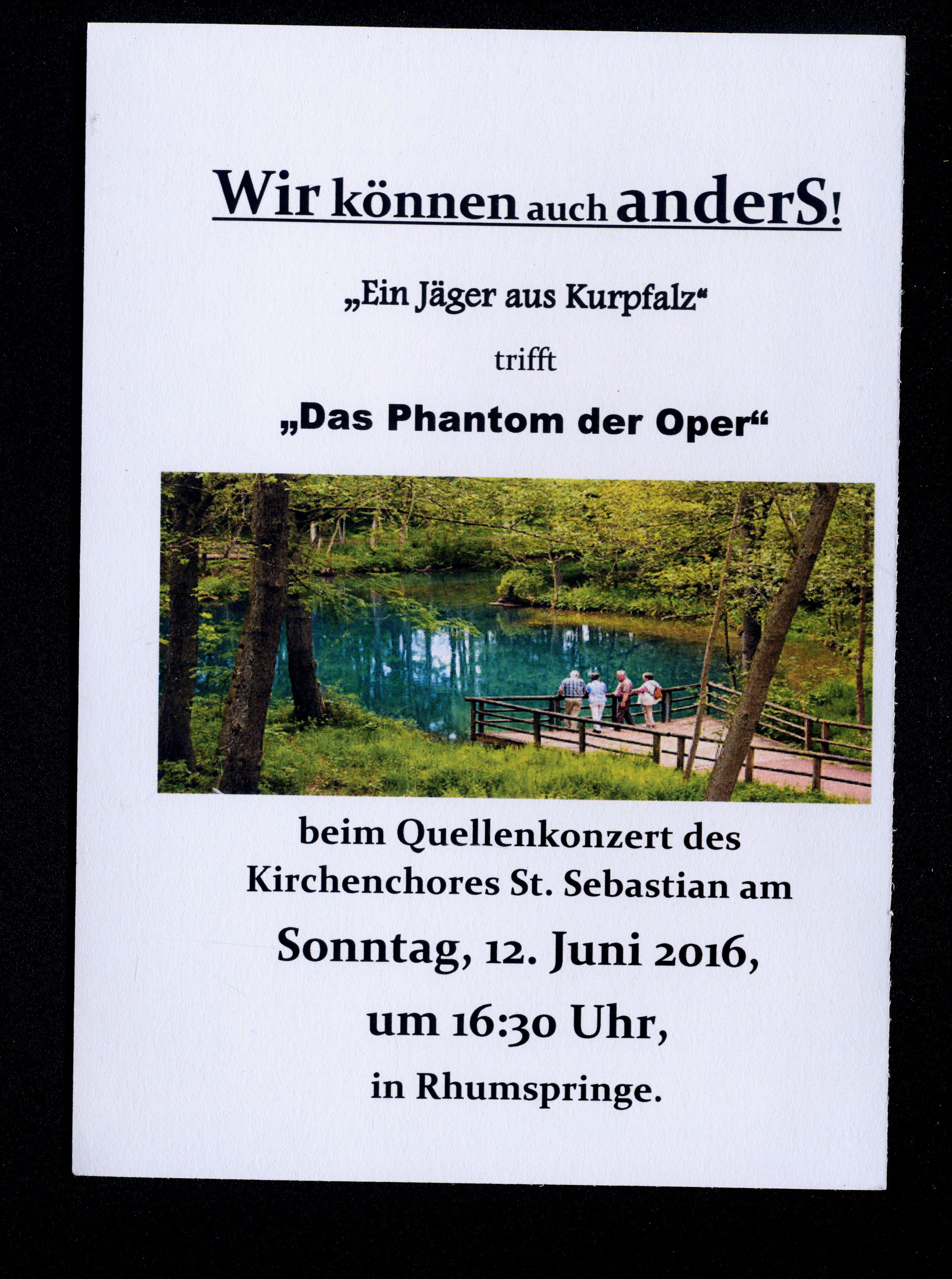 Ort Rhumspringe - Belege Beschreibung Druck im Postkartenformat Motive ''Ein Jäger aus der Kurpfalz'' trift ''Das Phantom der Oper'' Quellenkonzert Rhumequelle Format Sonderformat Jahr 2016 Verlag - Bestell- oder Individualnummer -