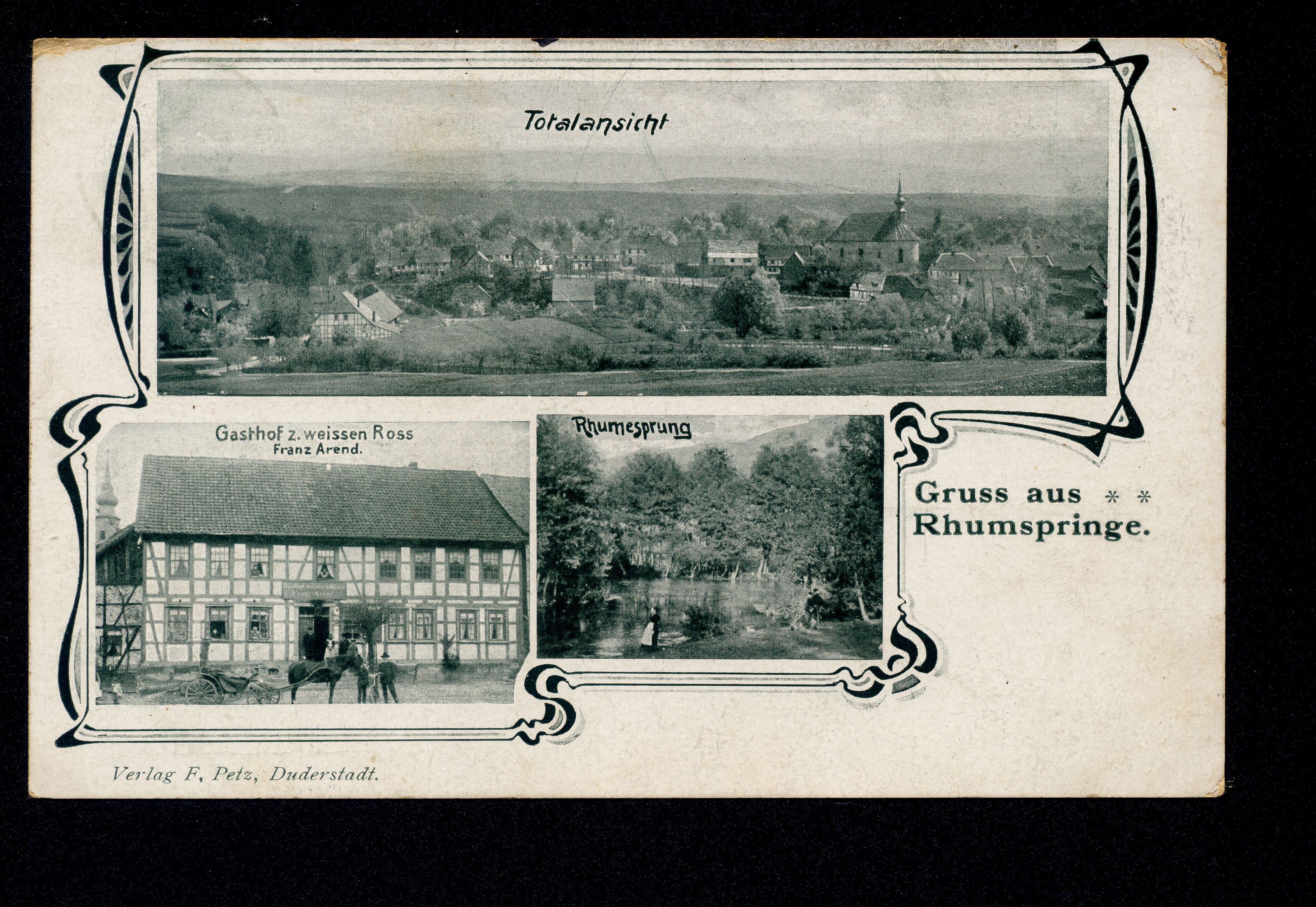 Ort Rhumspringe Beschreibung Variante "Farbe" und "Rückseite" Motive Totalansicht Gasthof z. weissen Ross Franz Arend Rhumesprung Format klein Verlag Felix Petz, Duderstadt Bestell- oder Individualnummer - Tags Rhumequelle Pferdekutsche Gasthaus