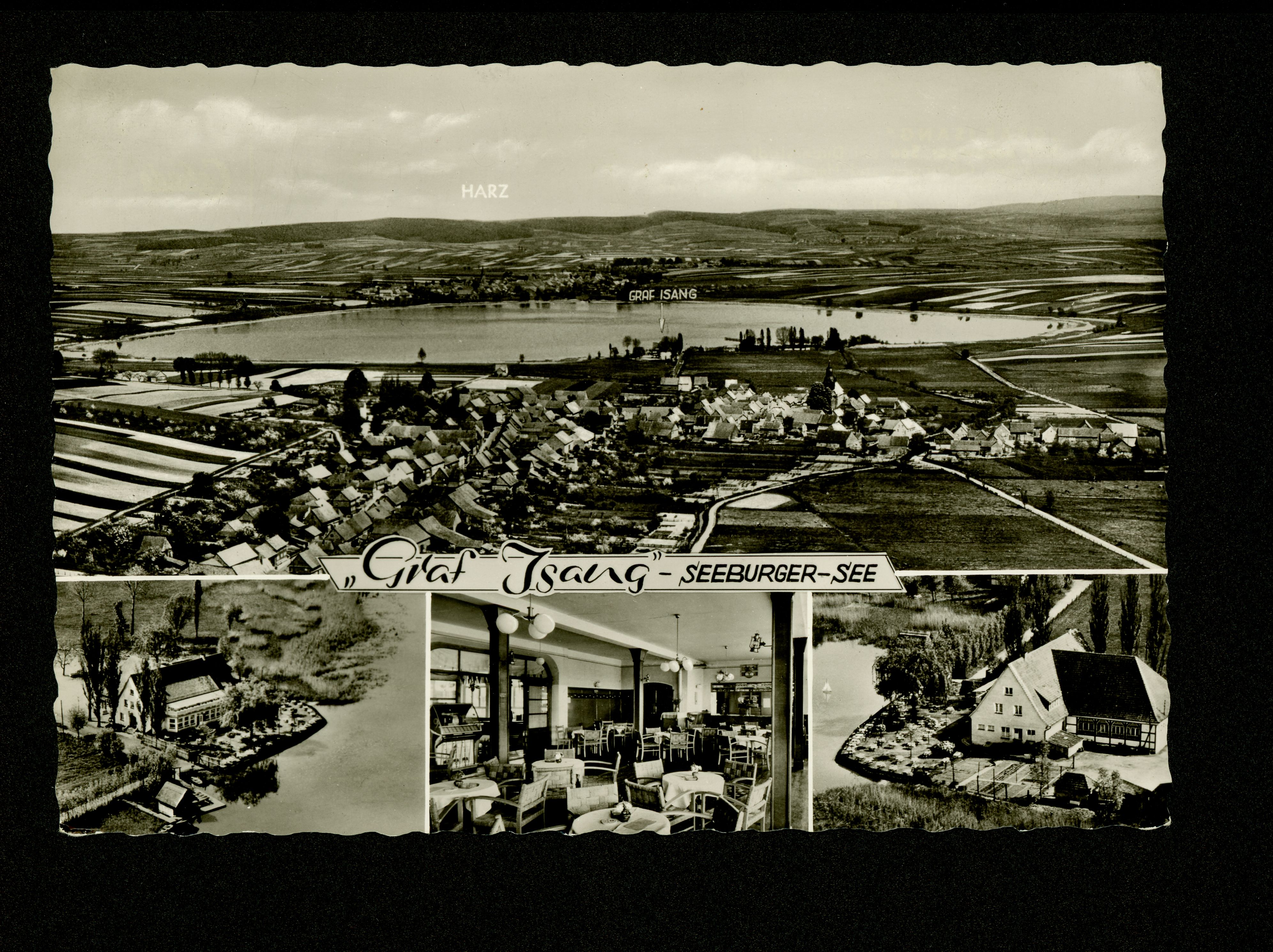 Ort Seeburg Motive ''Graf Isang'' - Seeburger See Luftbild Format groß Jahr 1963 Verlag Cramers Kunstanstalt, Dortmund Bestell- oder Individualnummer Sbg 02 63/2 Tags Bernshausen H. Rink Gasthaus