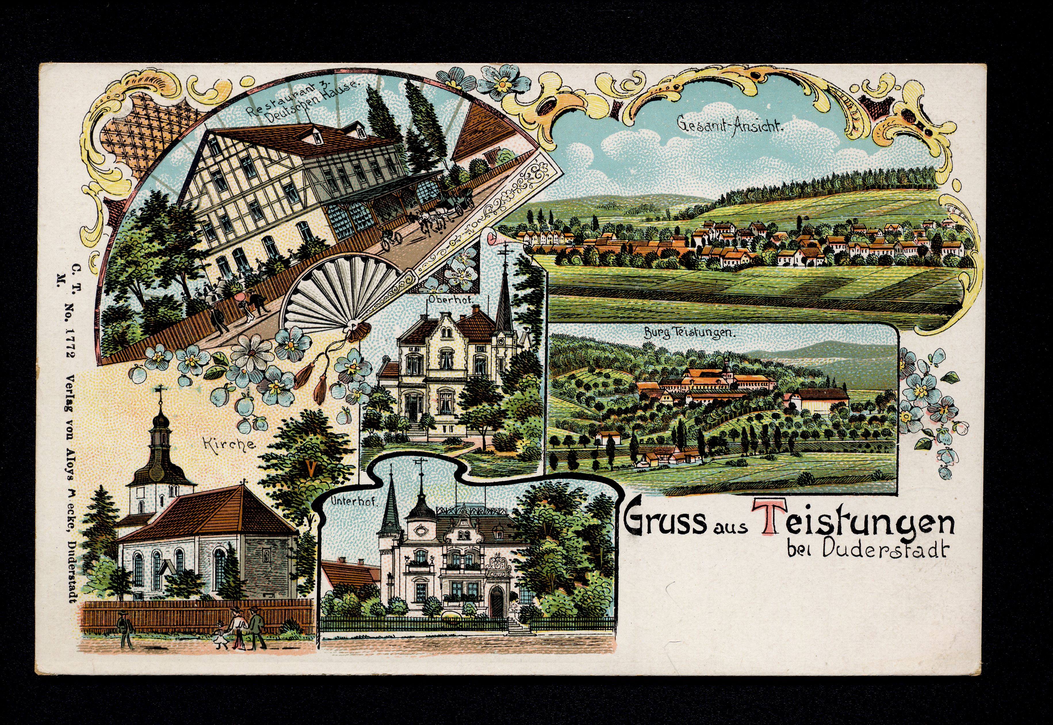 Ort Teistungen Motive Restaurant z. Deutschen Hause Kirche Unterhof Burg Teistungen Gesamt-Ansicht Format klein Verlag Aloys Mecke, Duderstadt Bestell- oder Individualnummer No. 1772 Tags Teistungenburg Gasthaus