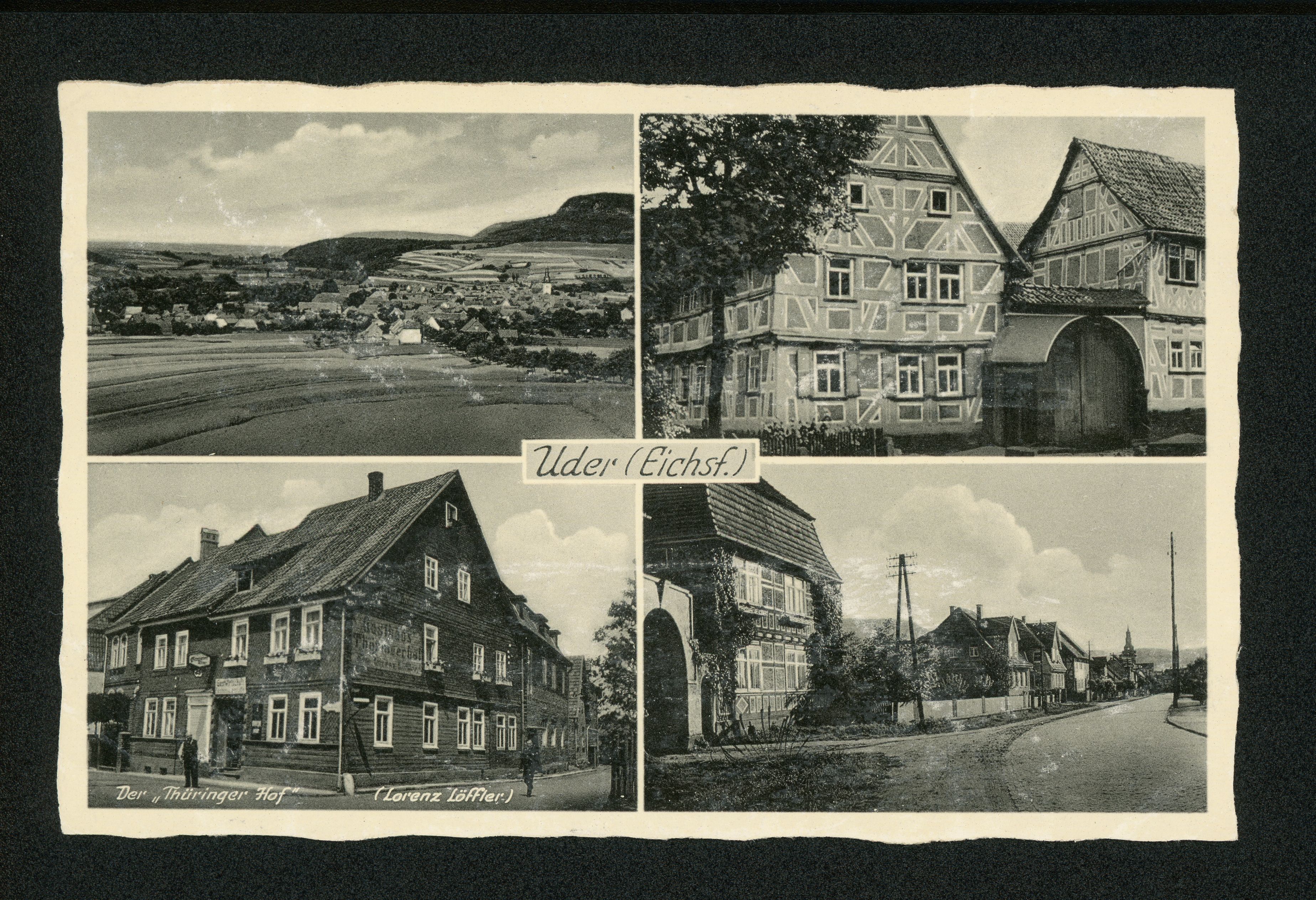 Ort Uder Motive Panorama Der ''Thüringer Hof'' 'Lorenz Löffler' Knorr‘sches Haus Straßenansicht Format klein Jahr 1937 Verlag Schmincke & Haase, Göttingen Bestell- oder Individualnummer 49/37 31608 Tags Gasthaus Gasthaus Thüringerhof
