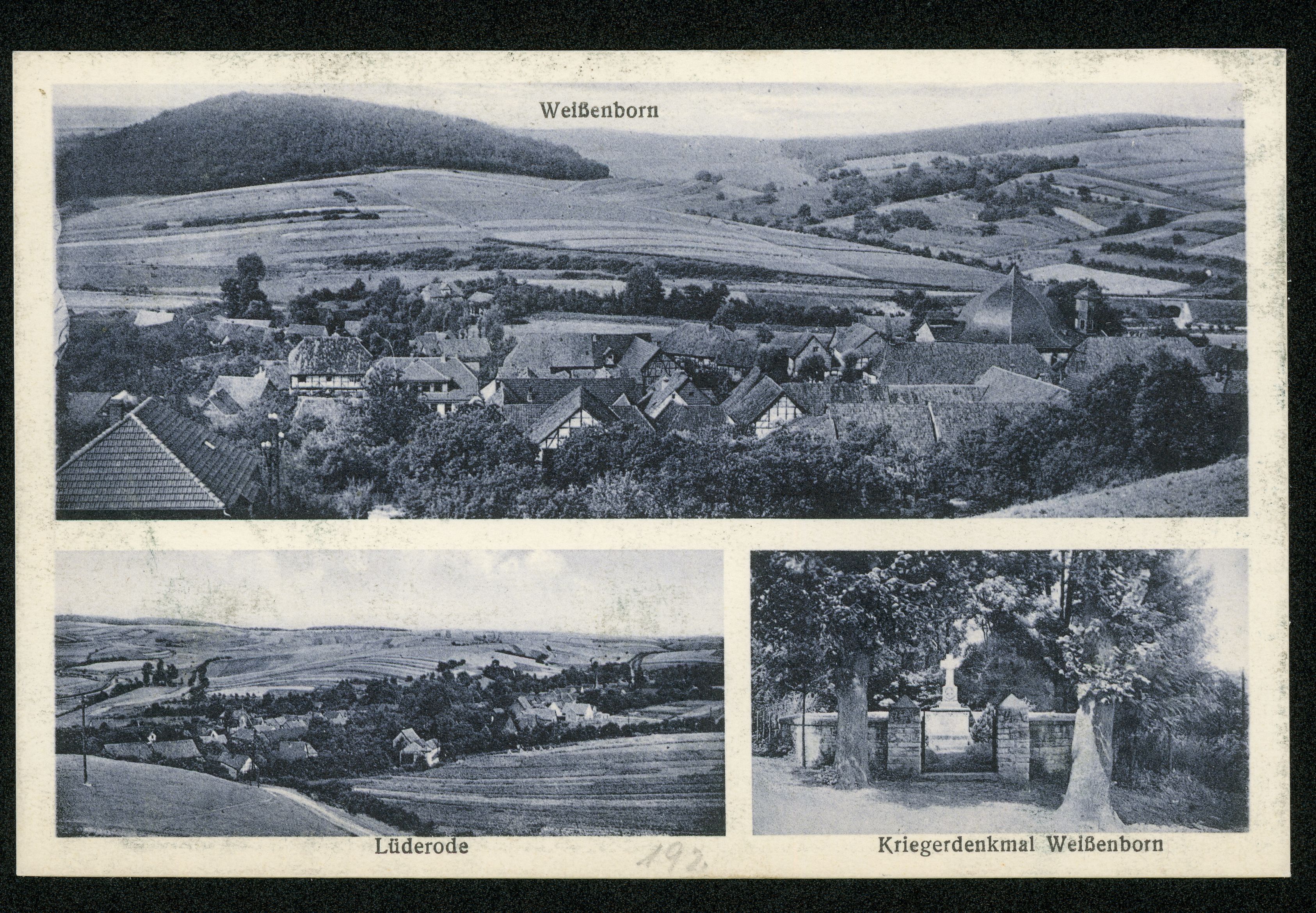 Ort Weißenborn-Lüderode Beschreibung Variante "blau" Sammlung: H.M.D. Motive Teilansicht Lüderode Kriegerdenkmal Weißenborn Format klein Verlag Aloys Mecke, Duderstadt Bestell- oder Individualnummer Nr. 192 85 x