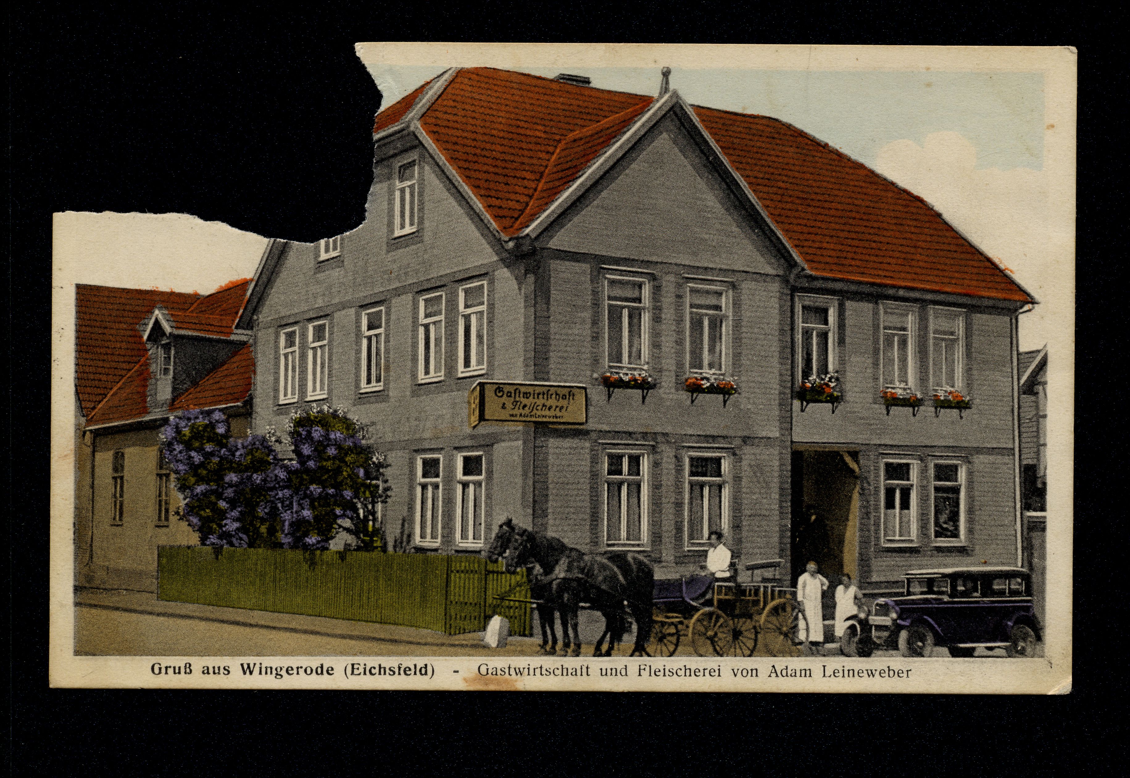 Ort Wingerode Motive Gastwirtschaft und Fleischerei von Adam Leineweber Format klein Verlag Anton Köhler, Uder Eichsfeld Bestell- oder Individualnummer t 92 Tags Pferdekutsche Gasthaus