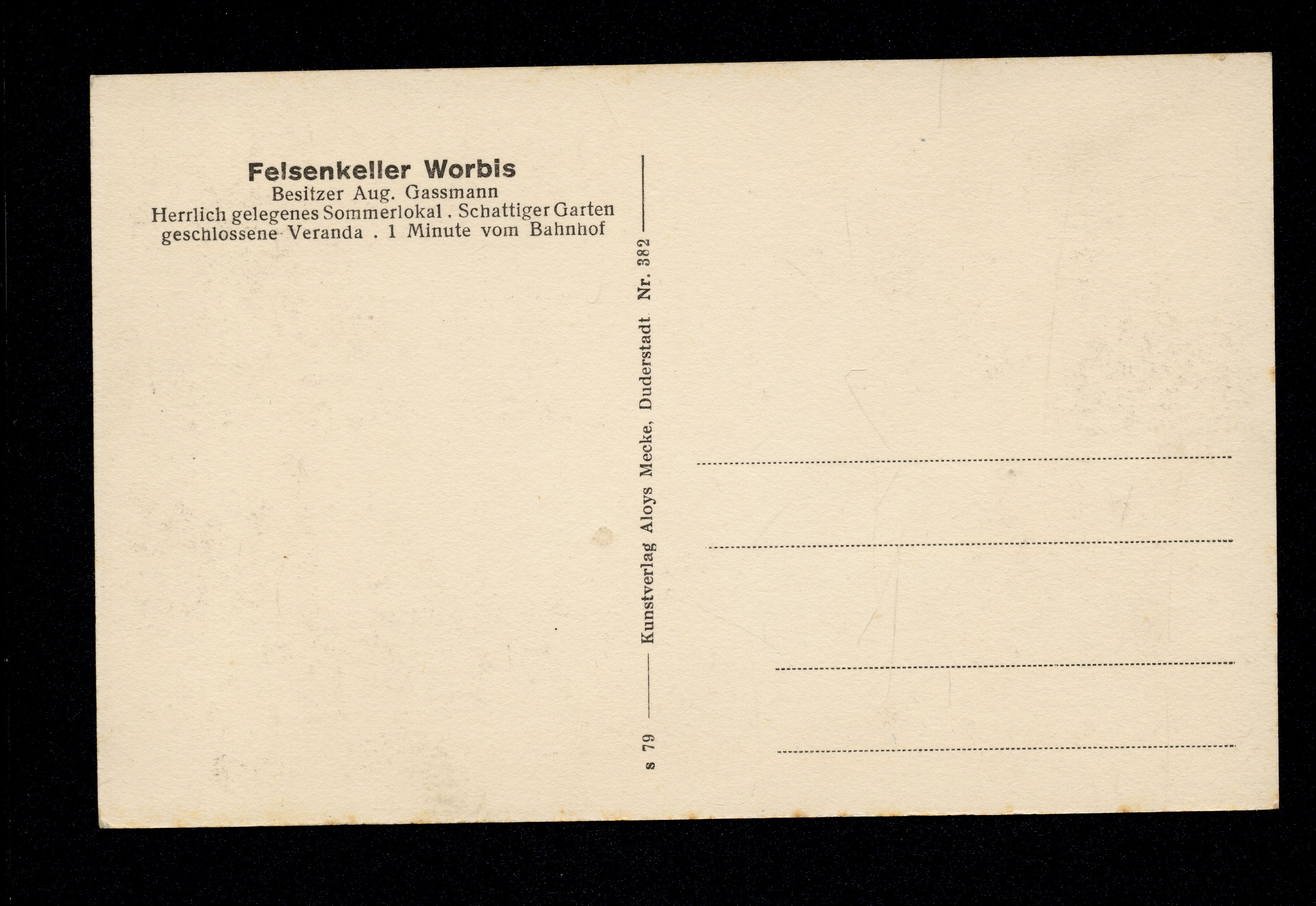 Ort Worbis Motive Felsenkeller Restaurant Format klein Verlag Aloys Mecke, Duderstadt Bestell- oder Individualnummer Nr. 382 s 79 Tags Aug. Gassmann Gasthaus