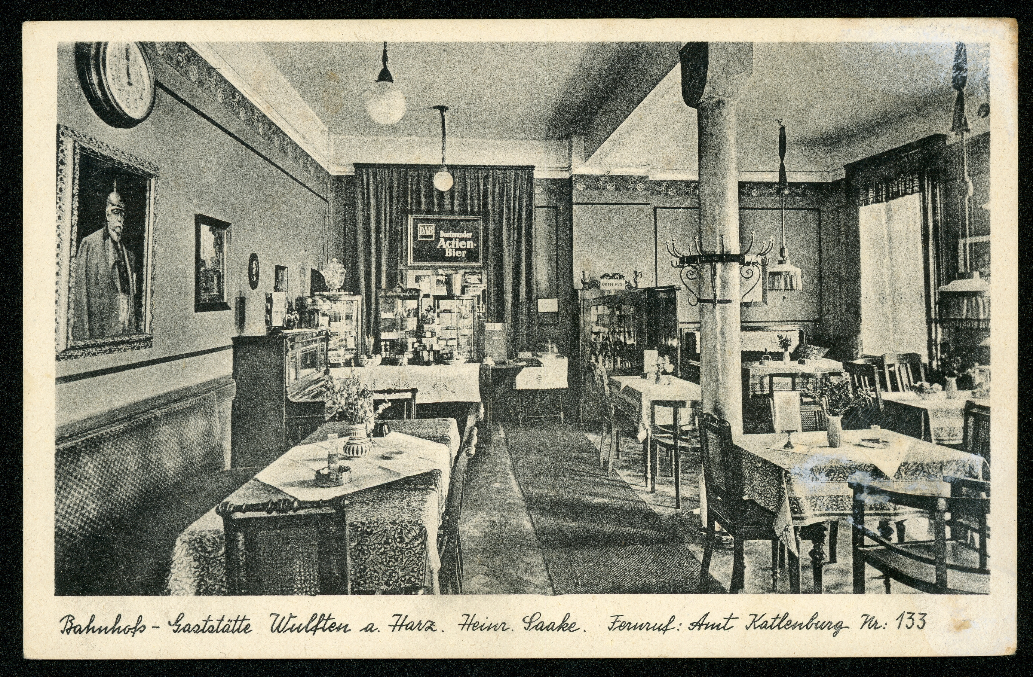 Ort Wulften Motive Bahnhofs-Gaststätte Wulften a. Harz. Heinr. Saake Format klein Verlag Georg Richers, Northeim Bestell- oder Individualnummer - Tags Gasthaus Heinrich Saake Dortmunder Actien-Bier Otto von Bismarck